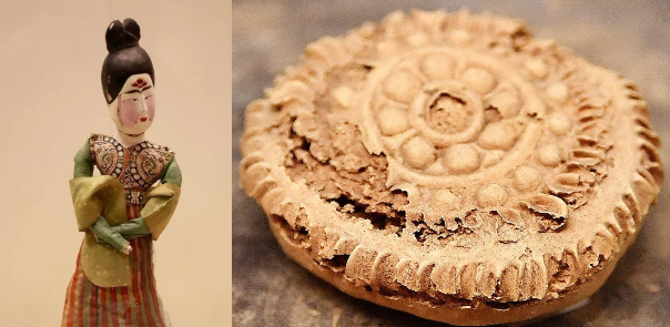 這塊約7公分大小,在吐魯番市阿斯塔納墓地挖掘出的古代糕餅,以小麥粉為原料,壓模烘烤製成,餅餡豐富,但因為它非常珍貴,無法破壞性取樣,至今仍然不清楚裡面是什麼餡,但有研究者研究認為,餡中應當含有棗子、核桃、葡萄和其他果仁。