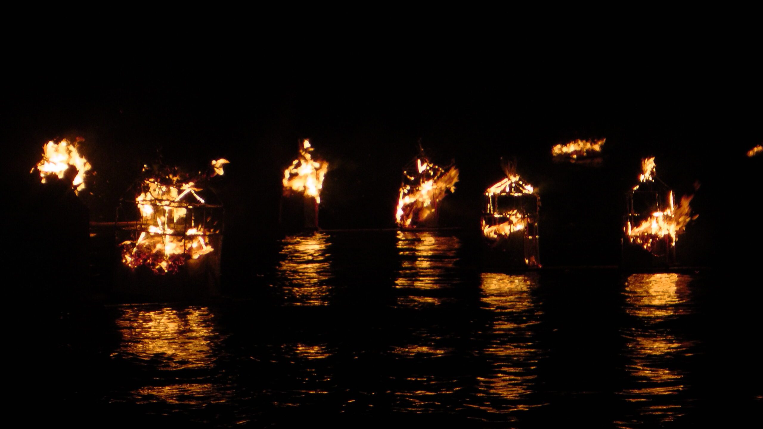 水上成串的水燈照亮了竹安河口,岸上吸引了大批駐足圍觀的民眾。宜蘭縣農曆七月關鬼門的重頭戲頭城搶孤,9/14日(農曆七月三十日)將在頭城搶孤文化園區舉行,而關鬼門的前一晚則是照例施放水燈,引領水中的好兄弟,前來享受人間的醮祭普度。