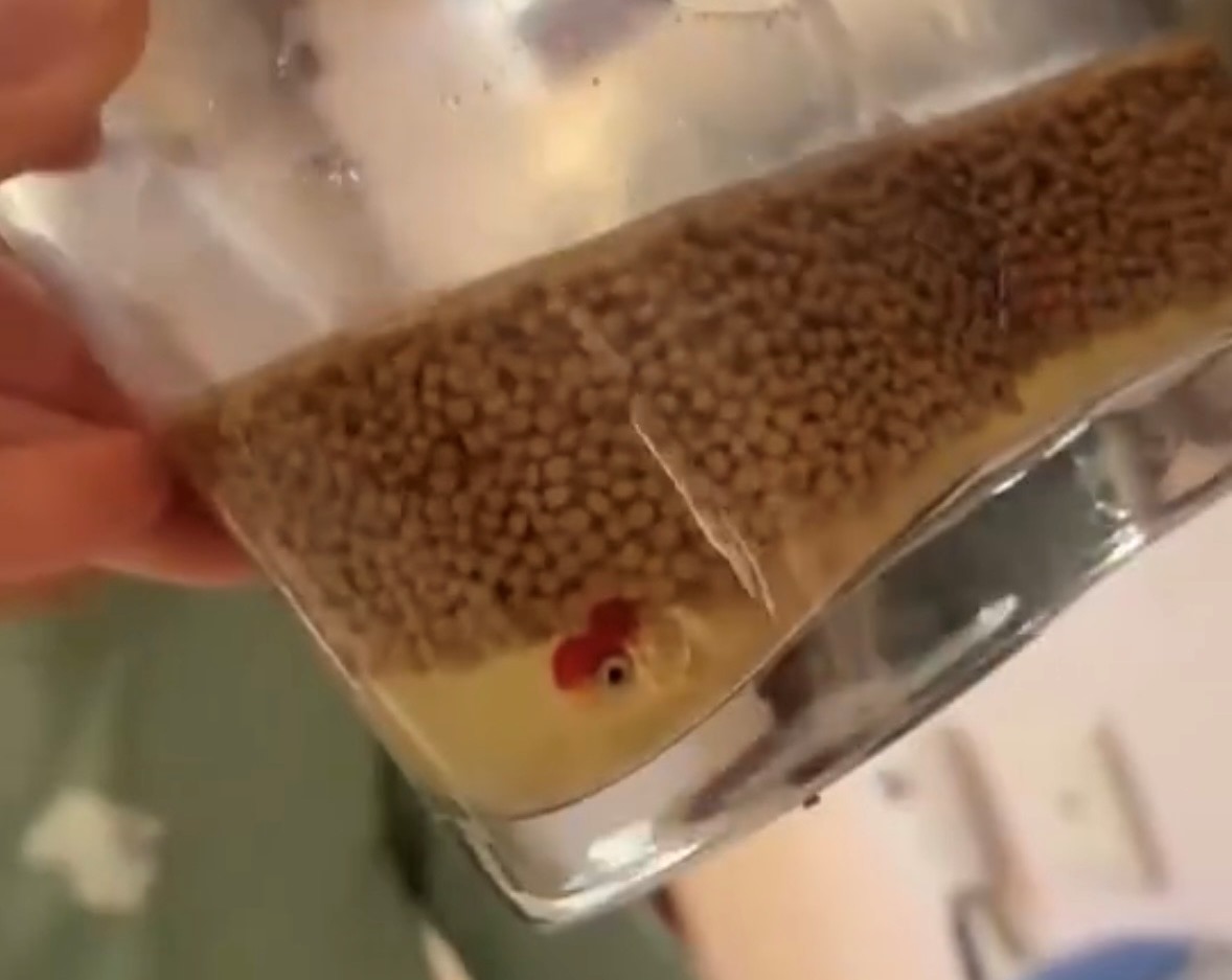 飼主馮女士發現後,直呼兒子一點動靜都沒有就讓人擔心,過去一看,這餵魚方式可真是讓人又好氣又好笑。要是晚去一步,這魚估計就要死了,好在趕快把飼料給撈起來,這條小魚看起來還好,並無大礙。