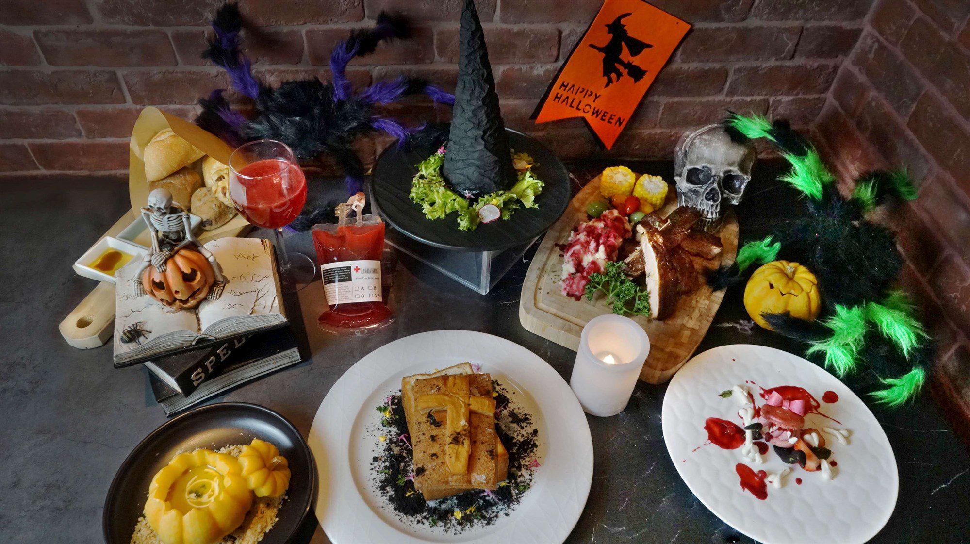 「大地古堡暗黑魔幻之夜」套餐由喜歡西餐廳團隊製作,主餐強打令人毛骨悚然的「人骨拼圖豬肋排」,由一截截帶骨豬肋排搭配玉米、馬鈴薯泥,最後加上血淋淋的甜菜根汁,視覺與味覺的雙重衝擊。有著大大十字架的「棺材板」,盛裝著新鮮小卷、番茄沙沙與暗黑墨魚燉飯,外圍爬滿小蜘蛛,棺材周圍撒上食用花與墨魚麵粉,讓人沉浸在恐怖開箱的緊張氛圍。帶有魔幻神祕感的「催狂魔巫師帽黑嚕嚕」,菜如其名呈現巫師帽造型,使人捨不得下手,內藏有酥炸竹炭雞腿肉,灑滿辛香七味粉,是一吃就停不下來的鮮嫩口感。「南瓜精靈濃湯」以整顆新鮮南瓜製作而成,活靈活現的外型盛裝著濃郁湯頭,在品嘗過程中仿佛也能感受南瓜精靈搗蛋又調皮的表情。點心更有主廚特製「地獄少女」覆盆子馬卡龍,張牙舞爪的動作,佐以鮮血般紅色莓果醬汁四處滴落在盤子上,完美呼應萬聖節血腥主題。其中最經典是餐後飲品「洛神楊桃凍飲」,讓賓客一秒變身暗夜吸血鬼,手持紅通通的血袋,啜飲著新鮮血漿,提供極度逼真感的萬聖體驗。