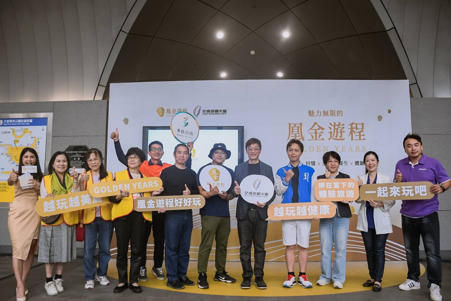 交通部觀光署今(28)日下午於捷運大安森林公園站陽光大廳舉辦【Cheer Golden Years】凰金樂齡旅遊推廣行銷活動,向樂齡族群推廣旅遊新品牌「凰金樂齡旅遊」,現場設置多項精采體驗活動及表演,吸引許多民眾攜家帶眷參與。