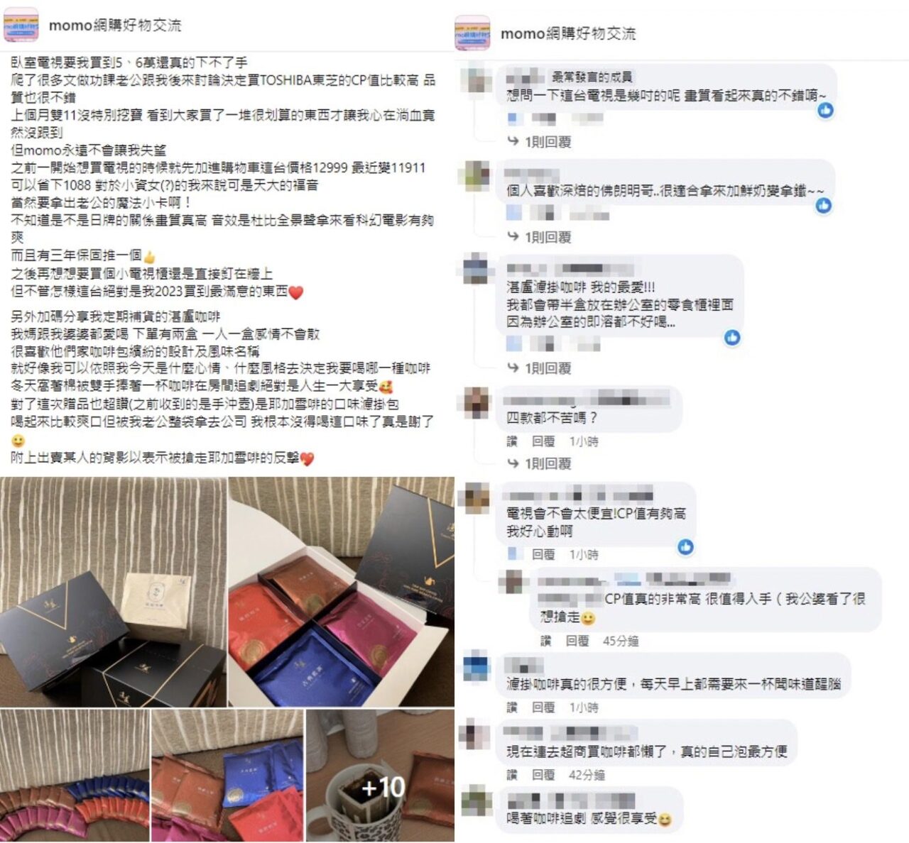 網友推薦的兩款優質商品,也在社團中引起熱烈討論「電視畫質跟音質都很清晰耶!不到1萬2可以入手,我好心動喔!」、「你的臥室感覺真的變小影院,直接躺著追劇還可以玩遊戲好爽喔,哈哈」、「湛盧濾掛咖啡!我的最愛!我是最喜歡深焙的佛朗明哥,比較不酸但口感又很濃郁,很適合早上來一杯醒腦」,「老公很犧牲耶,哈哈,東芝電視是58吋嗎?感覺跟你老公身長一樣了」「湛盧咖啡下單總共有80包吧?好划算!」