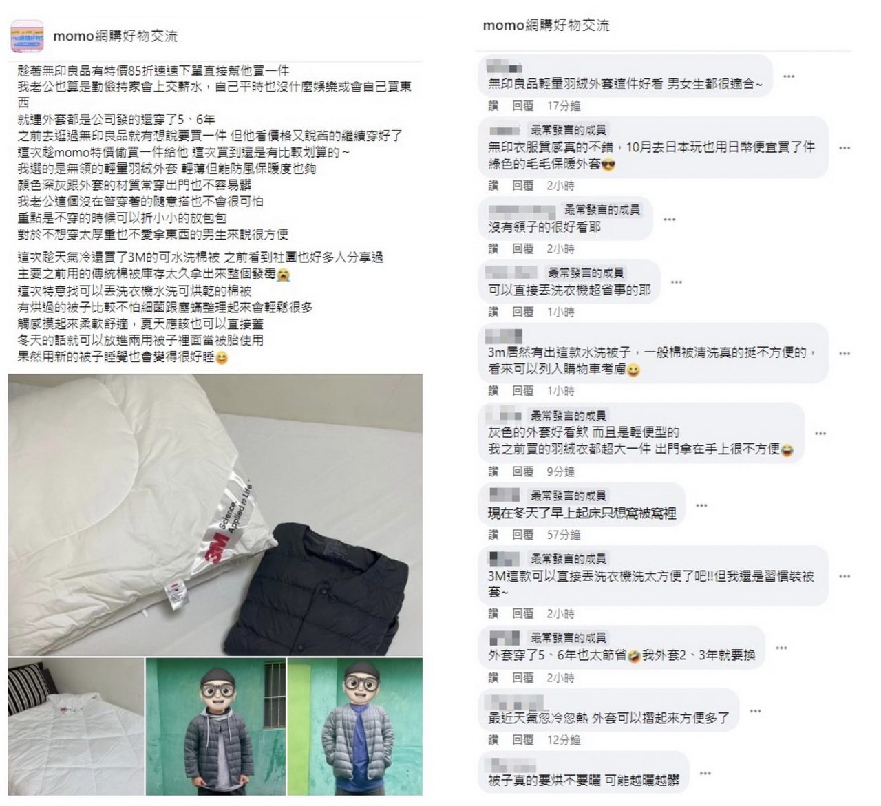 最近就有一位網友在「momo網購好物交流」社團分享,最近替自己和老公購入的「無印良品輕量羽絨外套」以及「3M可水洗棉被」。網友表示因為老公勤儉持家,每個月的乖乖上繳薪水而且沒有什麼開銷娛樂,因此做老婆的覺得幫老公添購新衣,讓他出門時能夠遮風擋雨。