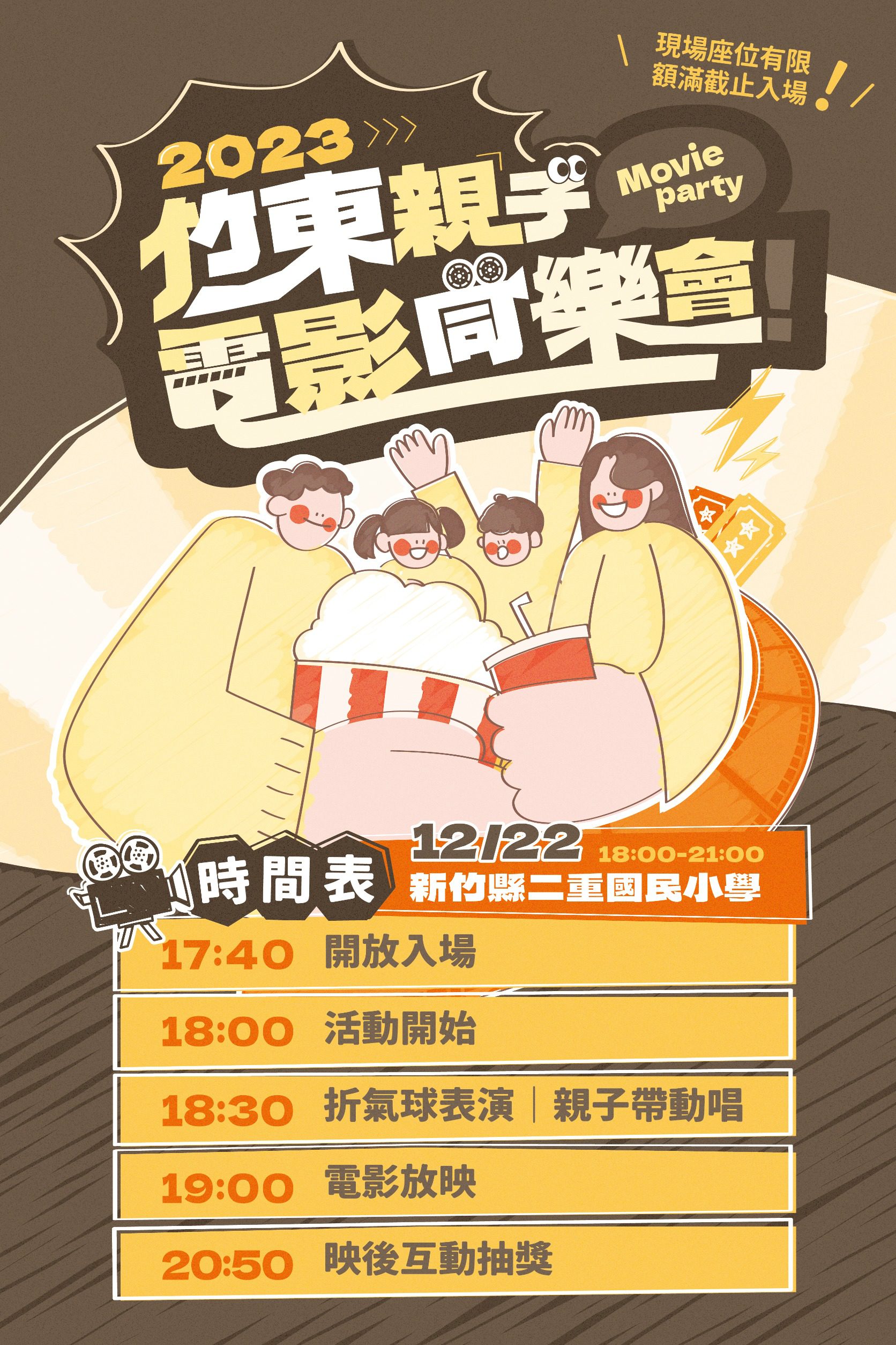竹東Fun電影啦!新竹縣竹東鎮公所訂於12月22日晚間5點40分到9點,在二重國小活動中心舉辦「竹東親子電影同樂會」觀影活動,開放300名親子入場免費看電影,還準備有爆米花和飲料讓大家邊吃邊看,鎮長郭遠彰邀請家長帶著孩子一起來歡度週末快樂夜。